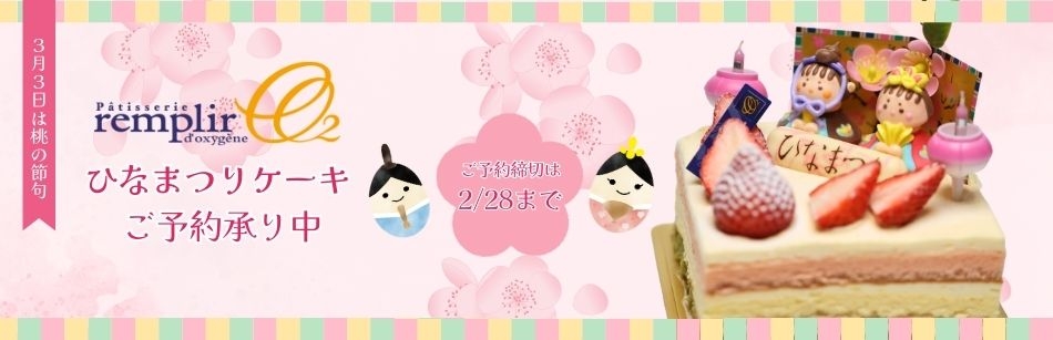 3月3日は桃の節句、ひなまつり。 お子様の健やかな成長を願って、可愛らしいひなまつりデコレーションケーキでお祝いしませんか? ひな人形や桃の花をあしらった、この時期だけの特別なケーキです。 ご予約は2月28日まで承っております。 ぜひこの機会に、ひなまつりのお祝いにご利用ください。