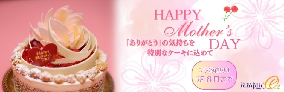 5月10日は母の日です。 日頃、家族のために頑張ってくださっているお母さんに、感謝の気持ちを込めて特別なケーキをプレゼントしませんか。 母の日だけの限定ケーキです。 受付は5月8日まで承っております。 是非、この機会に是非予約をお願いいたします。